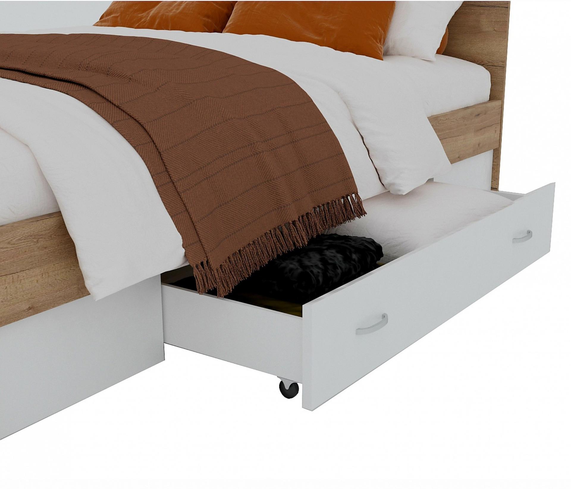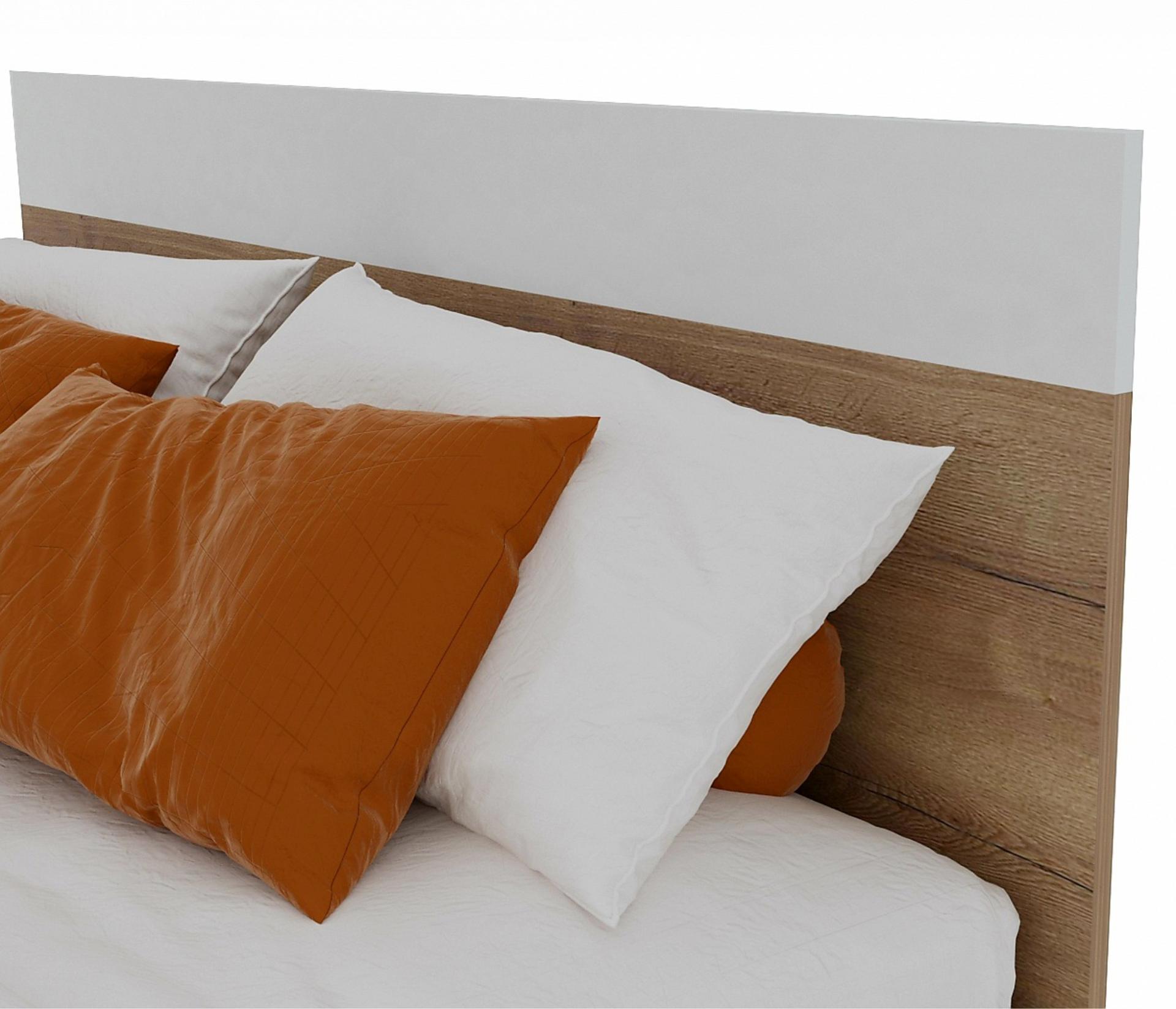 Изголовье кровати выполнено с сочетанием двух текстур – дуб золотой и белый.