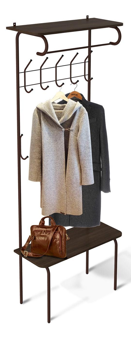 Предусмотрены крючки и штанга для верхней одежды, крючки для сумок, зонтов, детской одежды, верхняя полка для шапок, шляп и нижняя полка, на которой можно присесть или хранить обувь, тапочки.