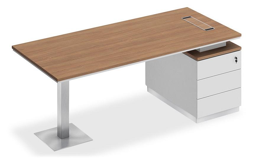 Стол состоит из столешницы, заглушки кабель-канала, металлической опоры и опорной тумбы.