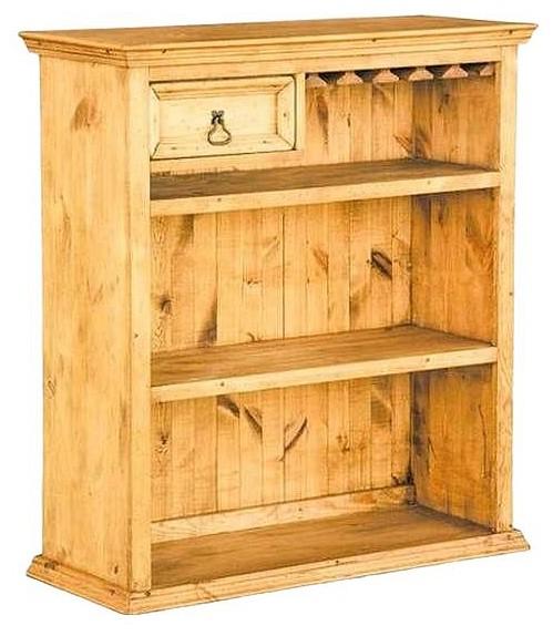Невысокая барная стойка для дома. Две встроенные полки без дверей разместят все необходимые атрибуты. В верхней части стойки расположены встроенный выдвижной ящик для различных мелочей и kit-бар для подвески бокалов. Задняя стенка, как и весь корпус, выполнена из массива сосны. Изделие поставляется в собранном виде.