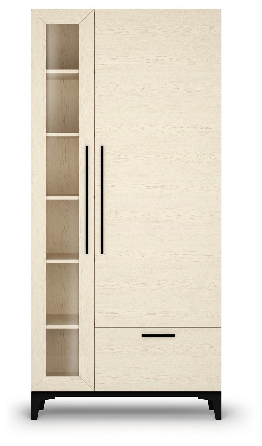 Шкаф-витрина имеет универсальную присадку для сборки на правую или левую стороны. Петли дверей оснащены доводчиком. Ящик выдвигается при помощи надежных направляющих скрытого типа. Благодаря высококачественным материалам и фурнитуре мебель послужит очень долго.