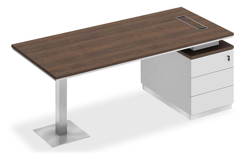 Стол состоит из столешницы, заглушки кабель-канала, металлической опоры и опорной тумбы.